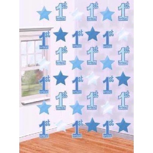 1 PACK OF 6 PIECE BLUE HAPPY 1ST BIRTHDAY STRING DECORATIONS|PACKAGED IN A CLEAR HANGING POLY BAG WITH A CARDBOARD INSERT. EACH ONE IN INDIVIDUAL POLY BAGS |APPROX SIZE: 7FT (2.13M)