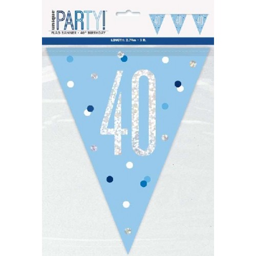 A 9 foot blue glitz Happy 40th Birthday flag banner.